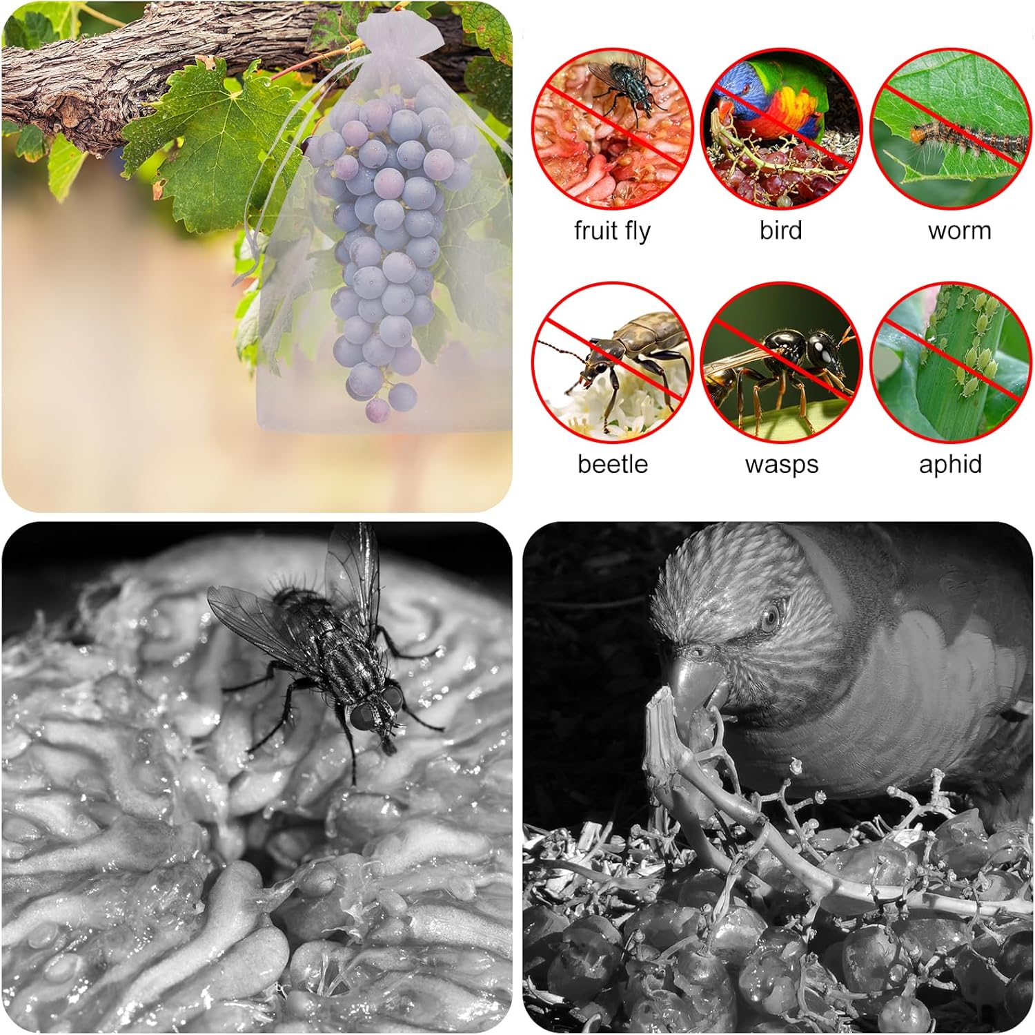 The fine mesh fruit bags are see-through to assess fruit health and are airy which allows the water and light to get through but keeps the bugs critters out.