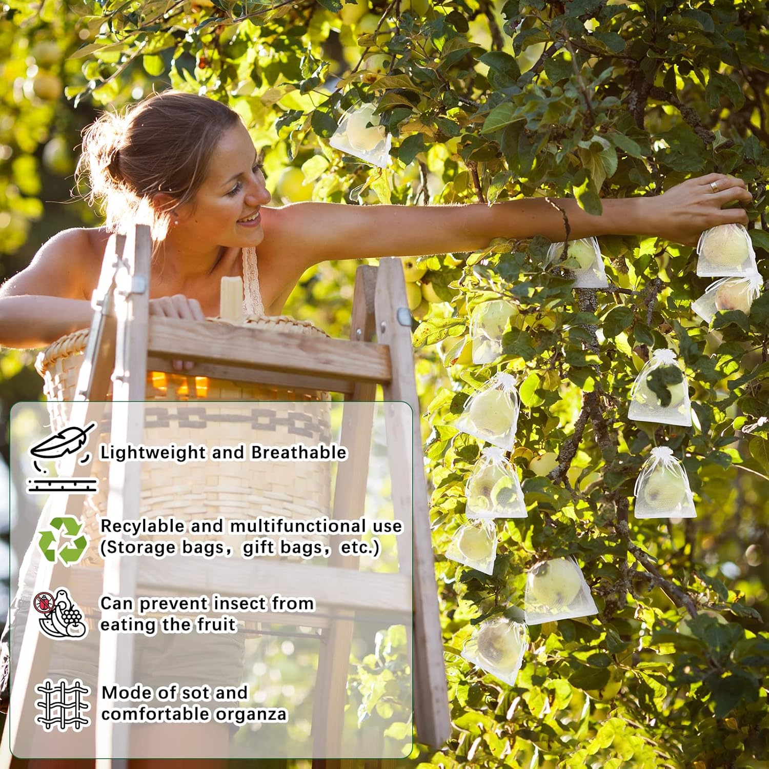 These fruit and vegetable protection bags are made of nylon fabric, they are sturdy, lightweight, soft and pliable so that it won't hurt the fruit and veggies when putting it on and won’t add weight to fruit-laden branches.